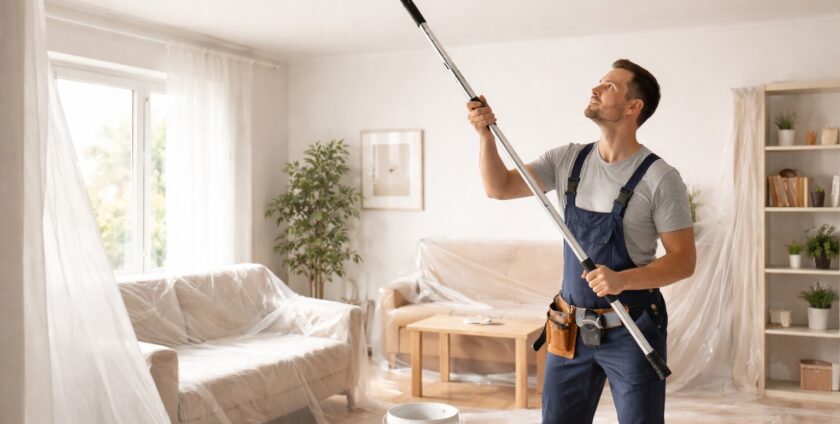 Deuxième erreur classique : travailler sans perche télescopique, en montant sur un escabeau. On fatigue vite, on perd en précision et on avance trop lentement. Le plafond se peint depuis le sol, avec une perche : c’est plus rapide, plus régulier et beaucoup moins éprouvant physiquement.